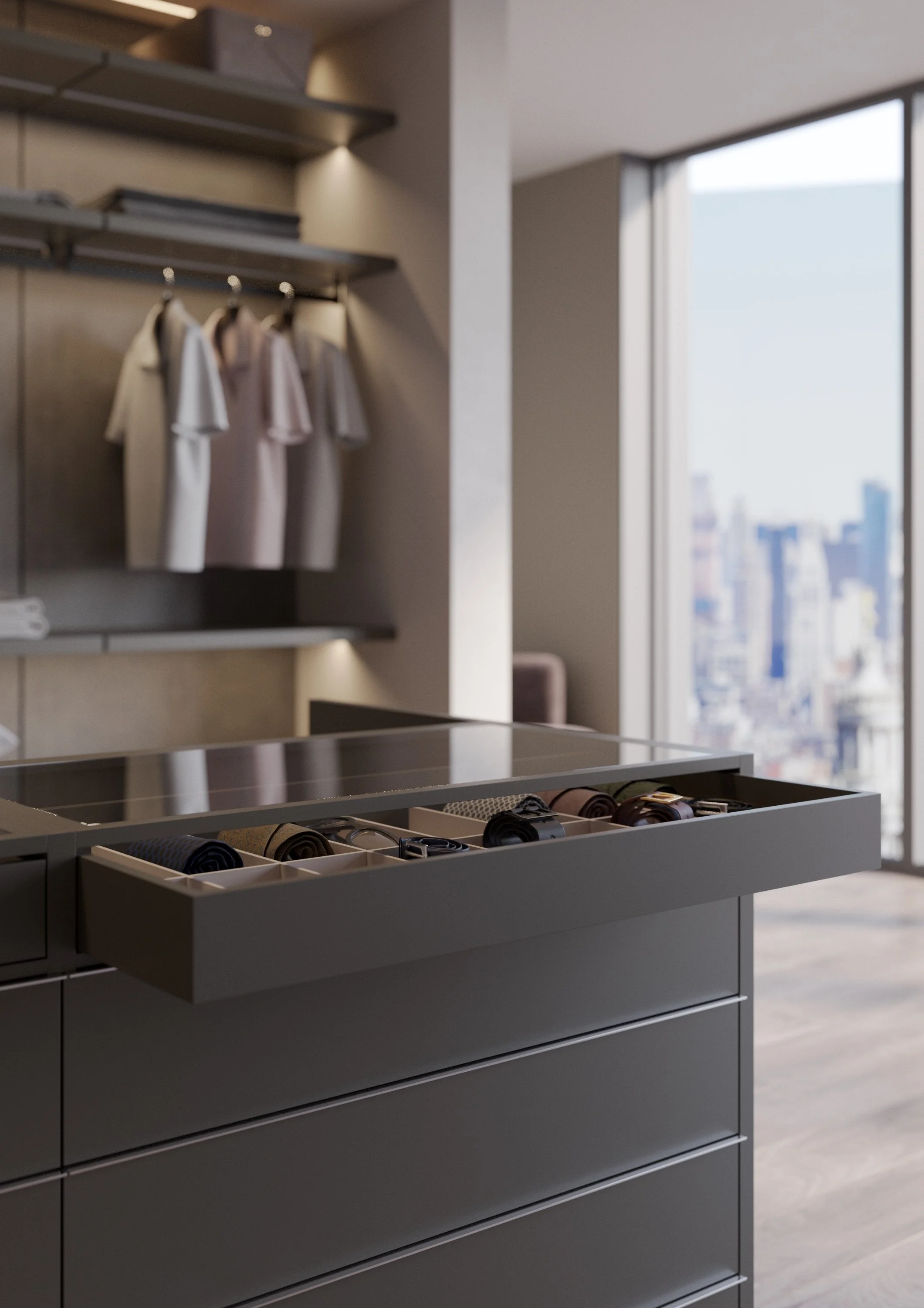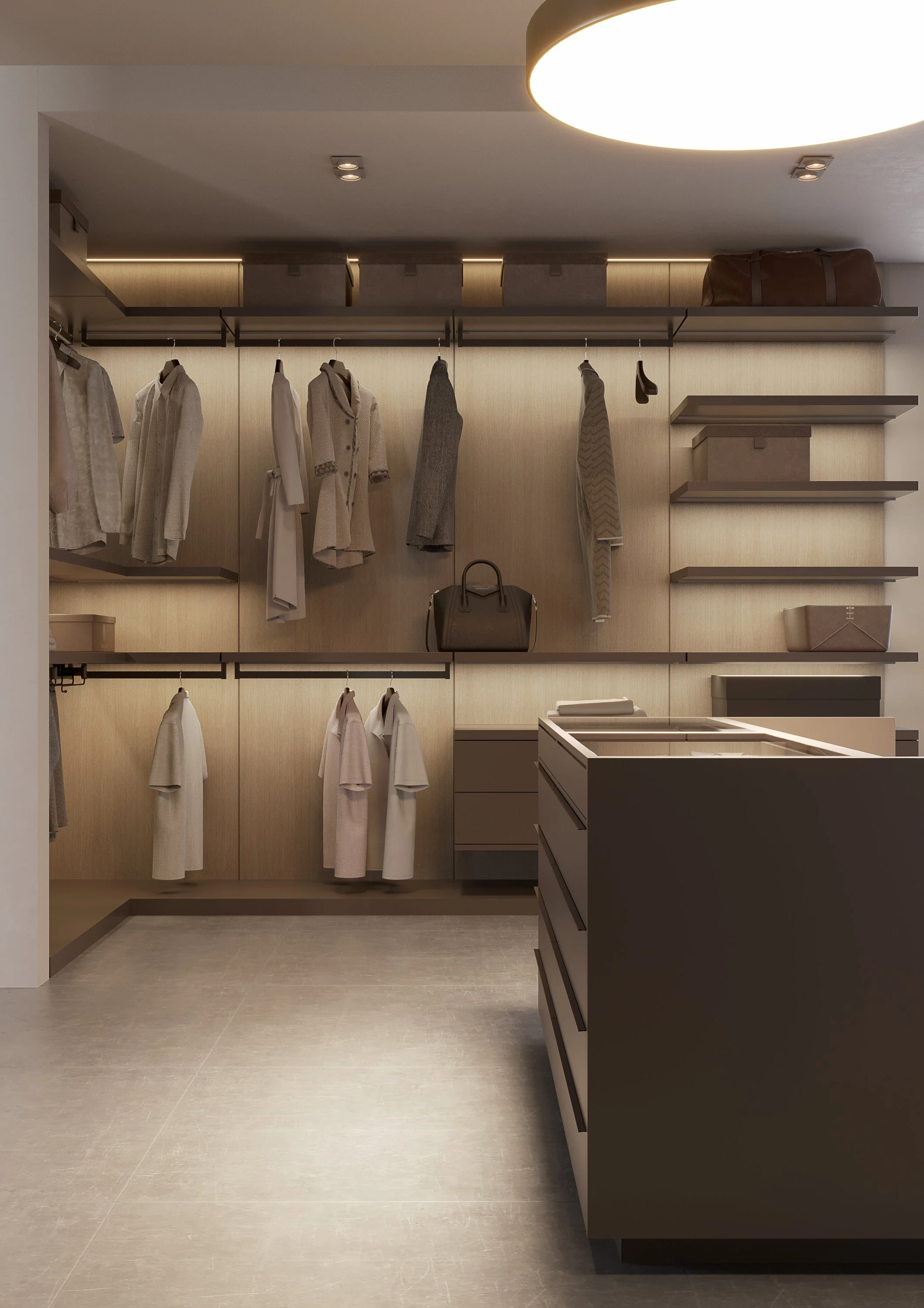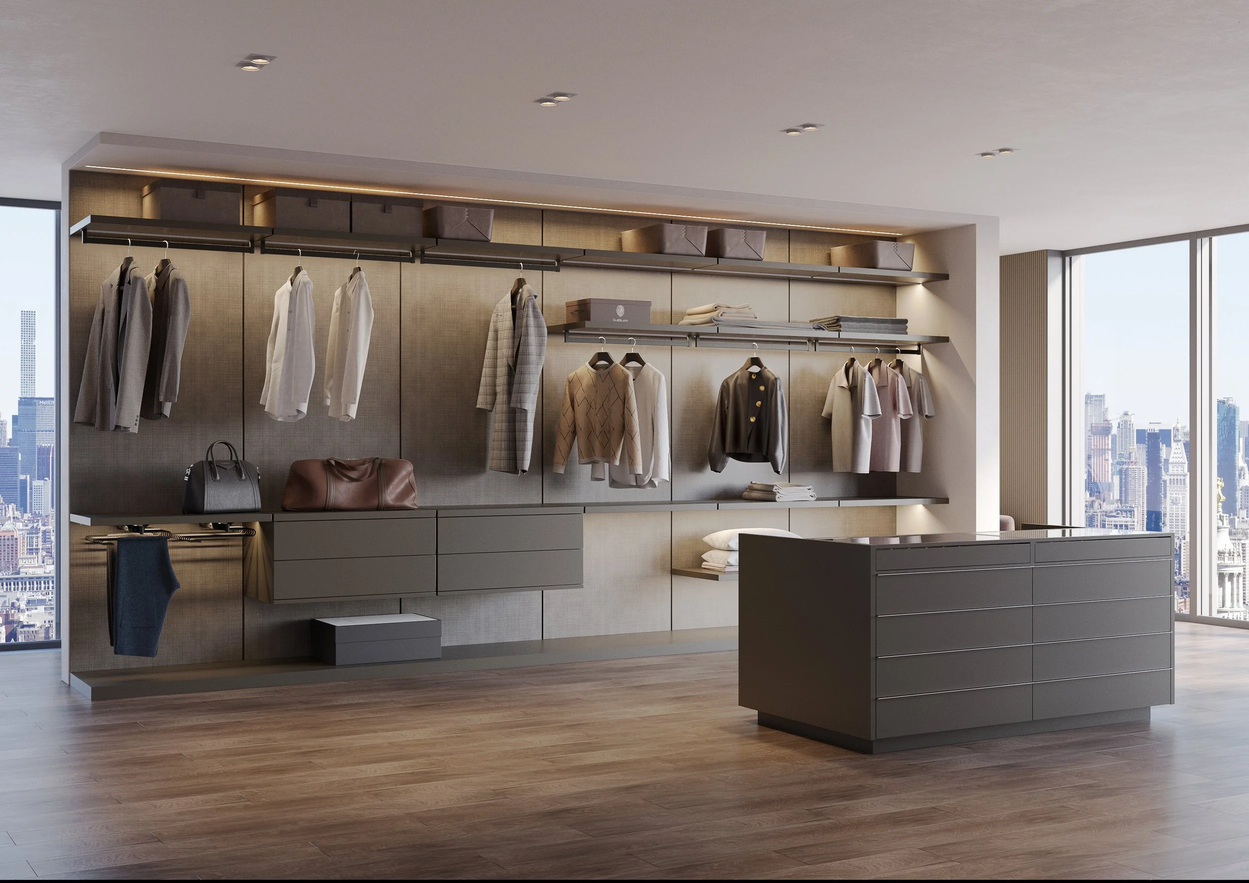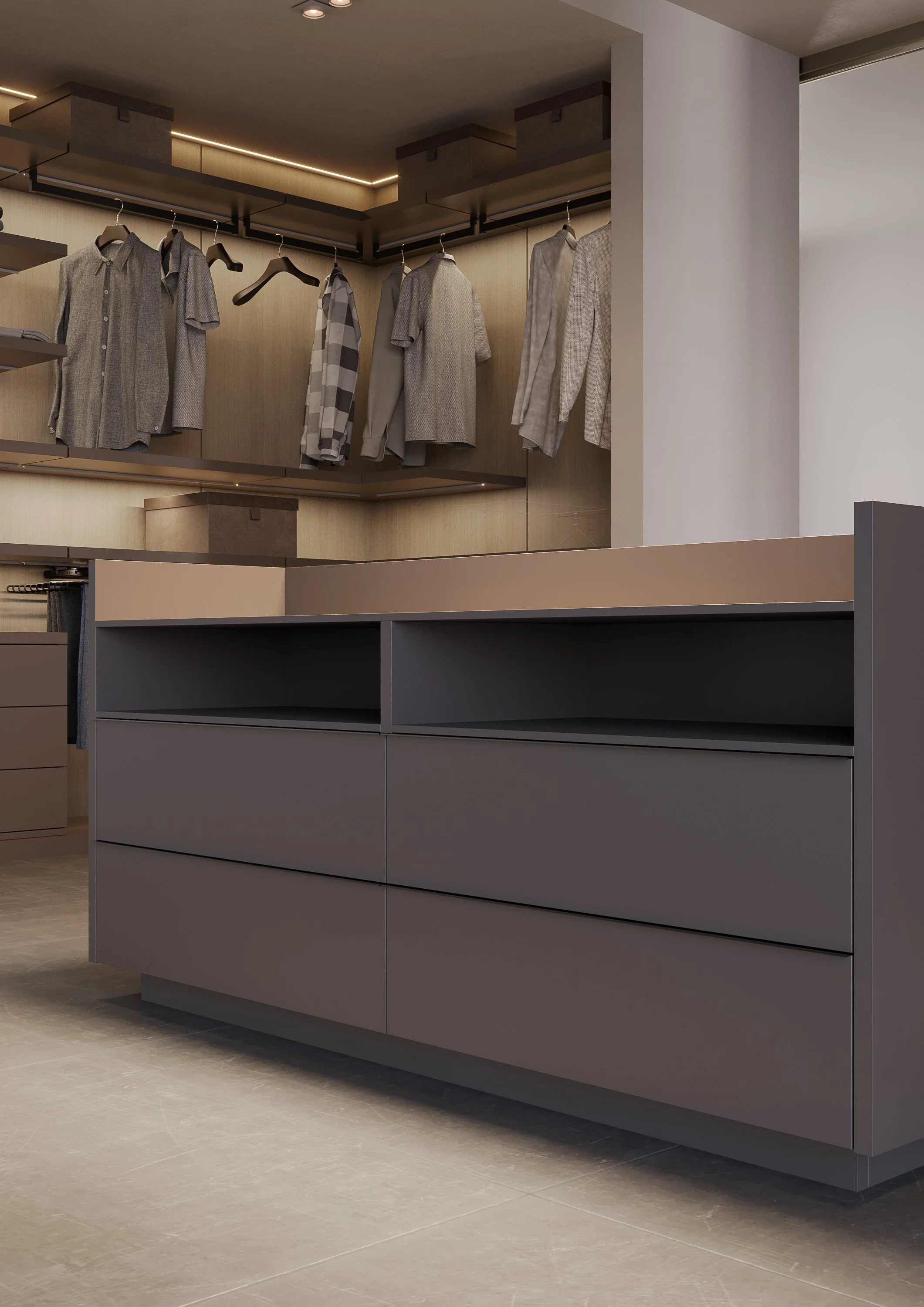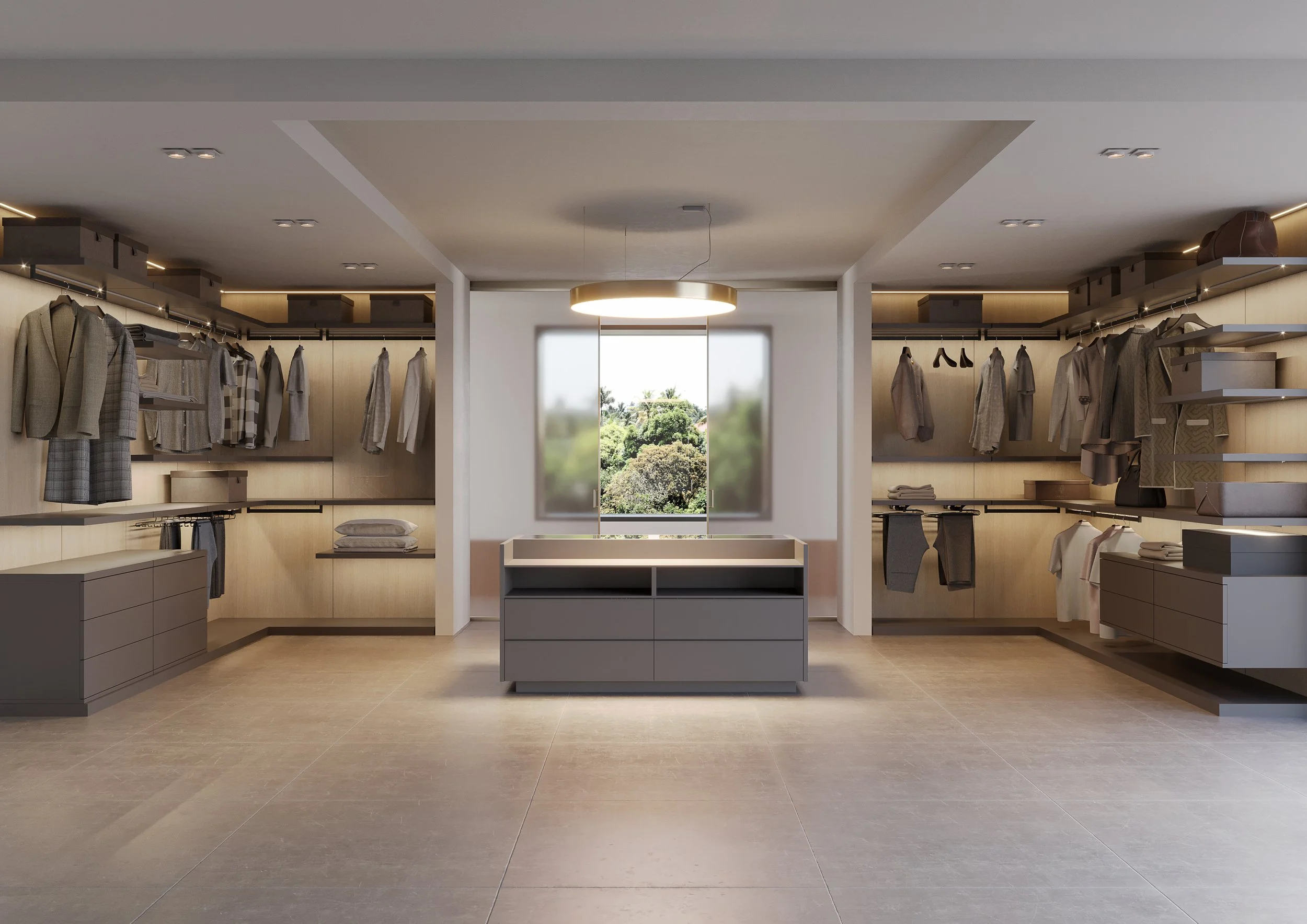 Cassettiera a isola Suspendia, fulcro funzionale ed estetico della cabina armadio. Un volume centrale che offre ampio spazio contenitivo e soluzioni dedicate agli accessori, valorizzati dal piano superiore in vetro.