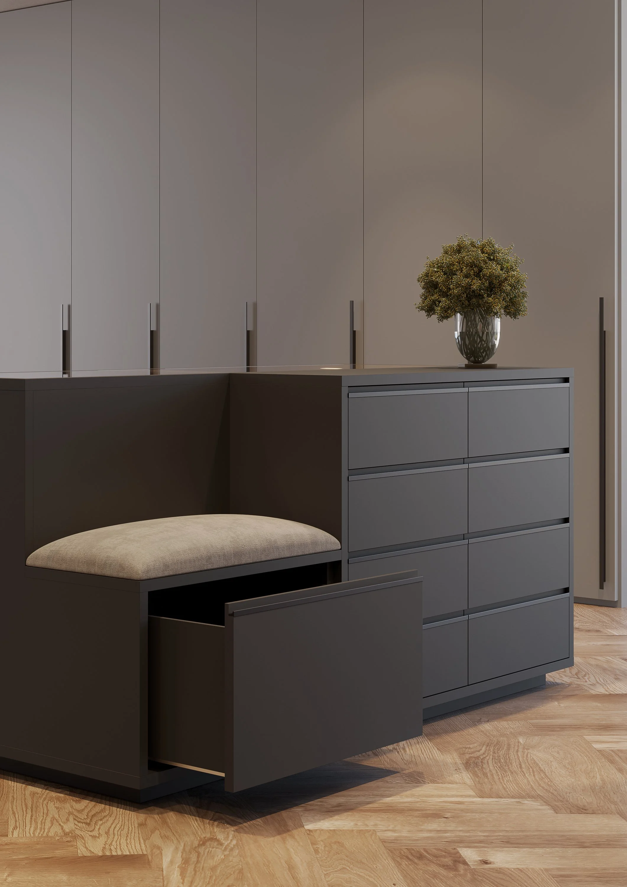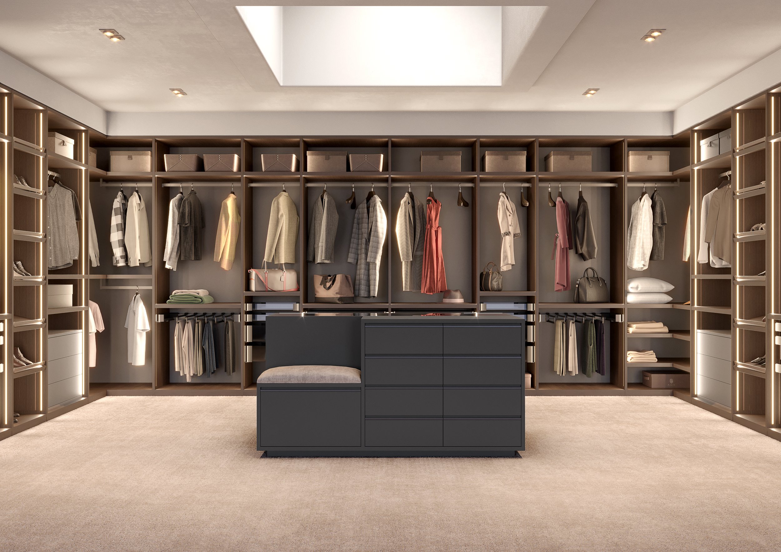 Nexus island chest, a versatile centerpiece of the walk-in wardrobe. Drawers, a day compartment, a seat, and storage units combined into a single volume, creating an organized, practical, and harmonious space.